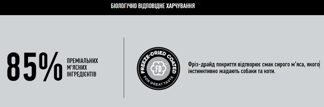 - 1/3 м’ясних інгредієнтів готуються при температурі 90°C зі свіжого м’яса курчат, індички та риби, забезпечуючи концентроване джерело високопоживних протеїнів, надходження яких неможливо забезпечити додаючи лише свіже м’ясо.