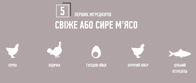 - 1/3 м’ясних інгредієнтів готуються при температурі 90°C зі свіжого м’яса курчат, індички та риби, забезпечуючи концентроване джерело високопоживних протеїнів, надходження яких неможливо забезпечити додаючи лише свіже м’ясо.