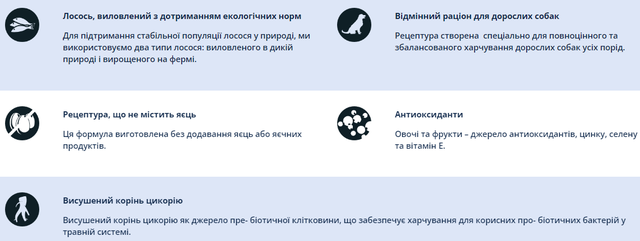 Рецептура без зерна, без яєць, багата омега жирними кислотами, які підтримують здоров'я шкіри, роблять шерсть гладкою та сяючою. Відмінна формула для харчування собак з чутливим травленням.