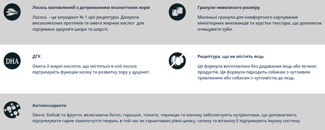 Рецептура без зерна, без яєць, багата омега жирними кислотами, які підтримують здоров'я шкіри, роблять шерсть гладкою та сяючою. Відмінна формула для харчування собак з чутливим травленням. Рецептура має унікальний смак та аромат копченого лосося, доповненого овочами, бобовими та фруктами, у формі маленьких гранул.