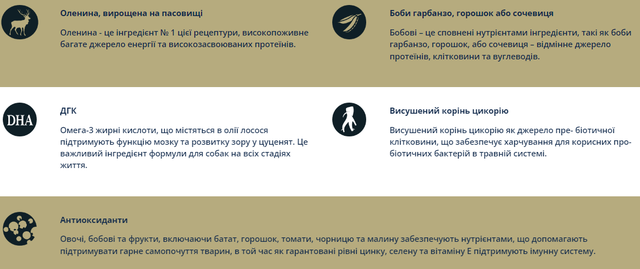 Склад: оленина (10%), борошно з м’яса ягняти, боби гарбанзо (10%), горох (10%), сочевиця (10%), борошно з гороху, висушені дріжджі, яєчні продукти, олія каноли, томатні вижимки, борошно з океанічної риби, олія лосося (джерело ДГК), мінерали, висушений корінь цикорію, томати, чорниця, малина, екстракт Yucca schidigera.