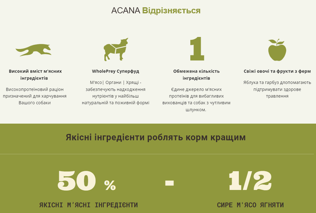 Обмежена кількість інгредієнтів зовсім не означає, що м'яса в кормі менше. Раціон ACANA Grass-Fed Lamb на 50% сповнений якісними м'ясними інгредієнтами у співвідношені WholePrey, включаючи м'ясо ягняти, органи та хрящі та вишукано доповнений неймовірно смачними яблуками сорту Ред Делішес. Раціон що забезпечує вашого собаку необхідними протеїнами та нутрієнтами, щоб він почувався щасливим, здоровим та сильним.