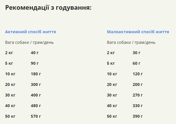 Денна норма годування для цуценят від 1,5-3 місяців становить дві добових дози дорослого собаки. Цуценятам 3-6 місячного віку добова норма корму становить 1,5 порції дорослого собаки. Цуценятам від 6-11 місяців рекомендується годувати 1,25 денної норми корму дорослої собаки. Під час вагітності денну норму корму слід збільшувати на 25% -50%. Під час лактації надайте собаці вільний доступ до корму.